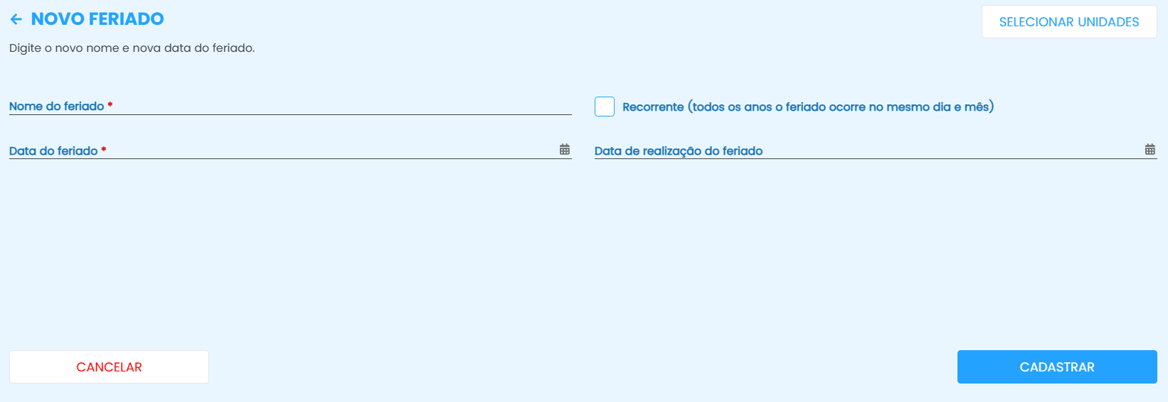 É possível cadastrar feriados vinculados a unidades específicas, permitindo a organização por cidade. Caso nenhuma unidade seja selecionada, o feriado será válido para todas as unidades cadastradas.