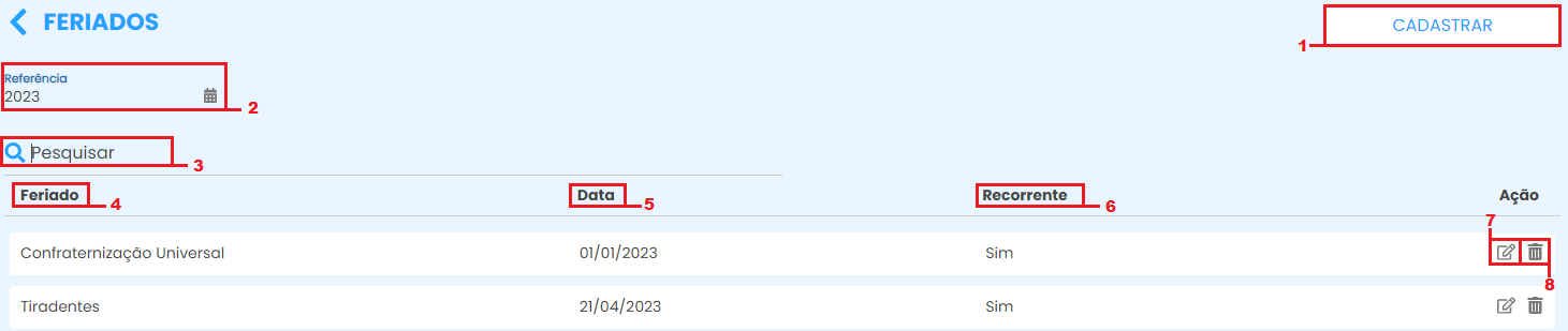 3. Utilize esse campo para pesquisar por um feriado cadastrado;