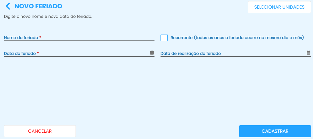 É possivel cadastrar feriados selecionando unidades cadastradas, permitindo organização por cidade.