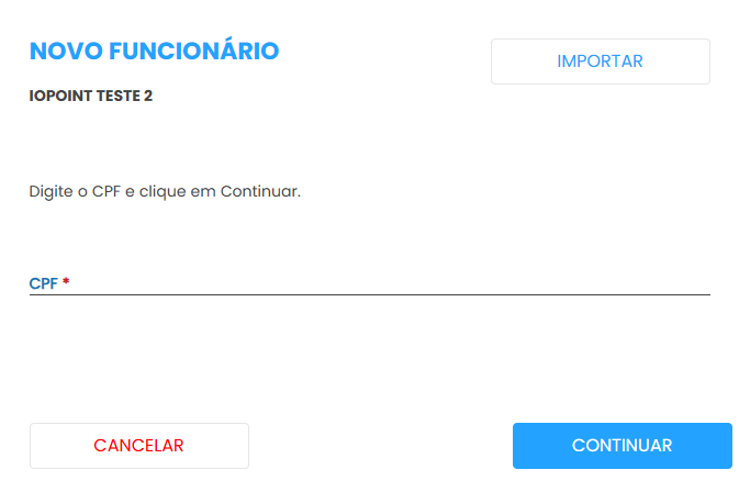 Insira o CPF do colaborador e clique em "Continuar" para seguir com o cadastro. Alternativamente, você pode utilizar o menu "Importar" para adicionar os colaboradores através de uma planilha.