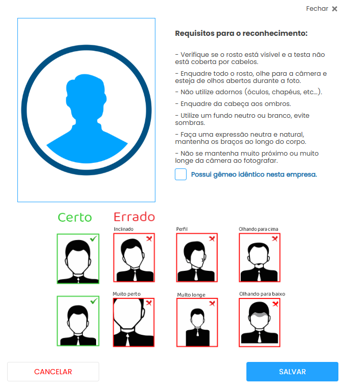 image.png Primeiro ícone de ação: cadastre a foto do colaborador para o reconhecimento facial, seguindo os requisitos descritos.