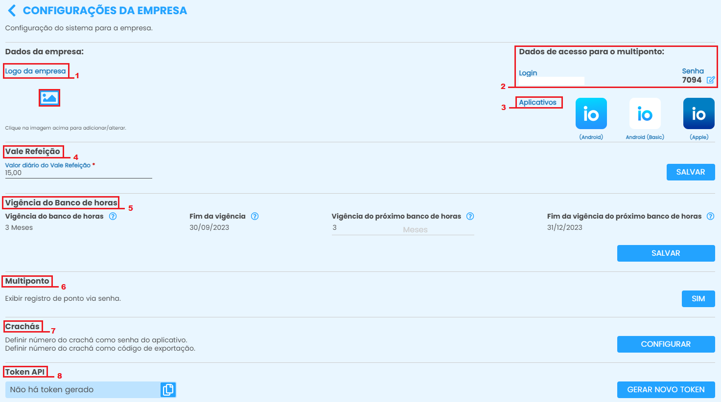 7. Nas configurações de crachá é possível definir o numero do crachá do colaborador como senha do aplicativo e código do funcionário na exportação. Primeiro passo a realizar é cadastrar o numero do crachá na ficha do colaborador, em seguida, nas configurações da empresa, clique para configurar os crachás;