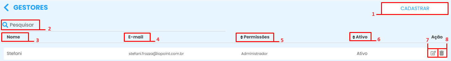 Na funcionalidade de gestor você vai visualizar os gestores cadastrados e cadastrar outros novos, se necessário.