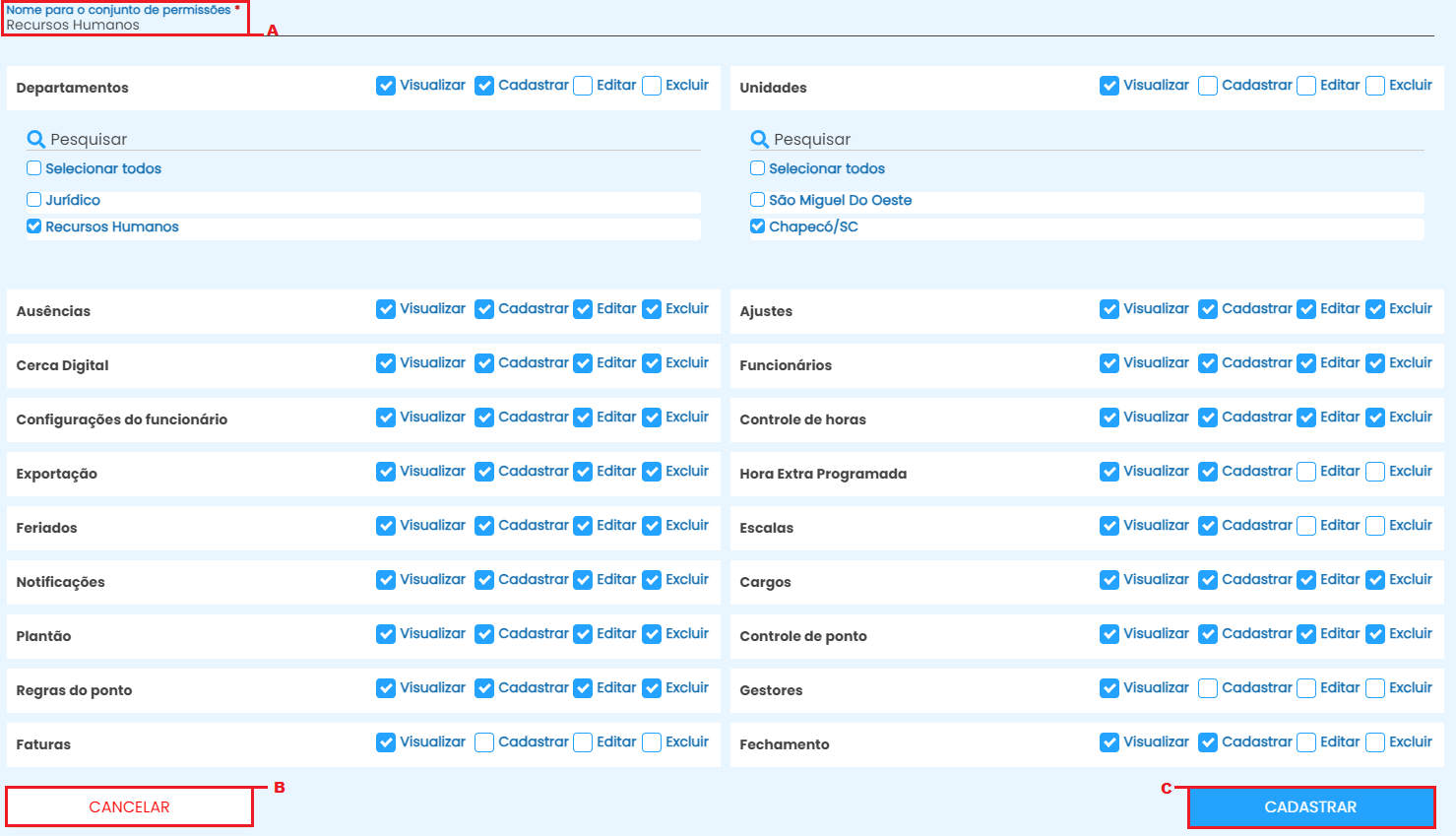 As alternativas de departamento, unidades e funcionários devem estar selecionado ao menos a opção de visualização. Os funcionários serão definidos de acordo com os departamentos escolhidos.