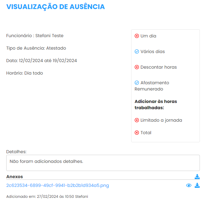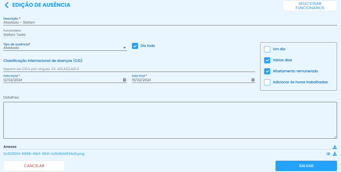 Adicionar anexos: Possibilidade de adicionar uma foto, geralmente utilizado em ausências de atestado;