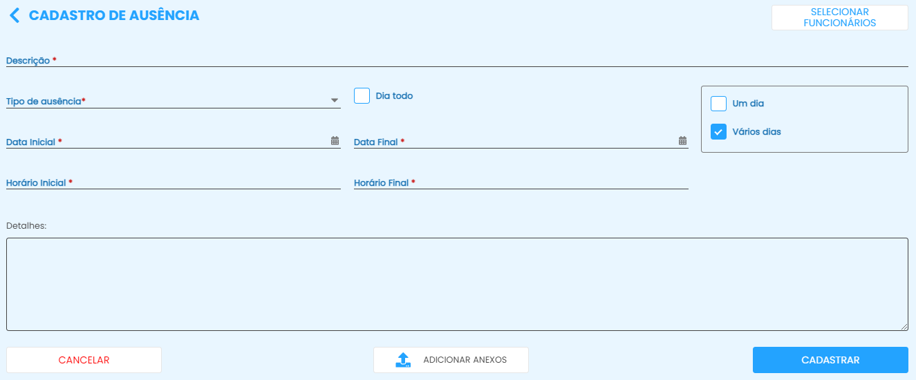 Selecionar funcionários: selecione os funcionários que vão fazer parte dessa ausência;