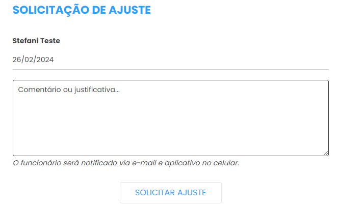 Solicitar ajuste: Para solicitar um ajuste de ponto do dia para o colaborador, clique em solicitar ajuste e informe uma justificativa, funcionário vai receber uma notificação no aplicativo e clicando em cima vai ser direcionado para o dia que foi solicitado.