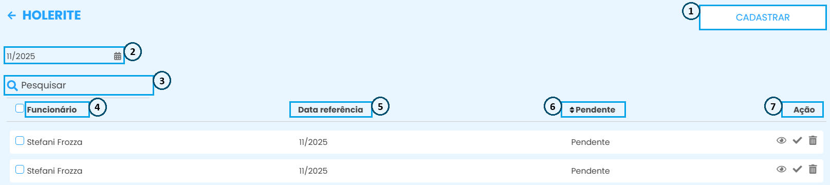 - Utilize a barra Pesquisar para localizar um colaborador ou holerite.