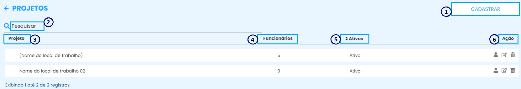 Os projetos representam os locais de trabalho dos colaboradores, nos quais será possível registrar o tempo dedicado por cada um em cada local.
