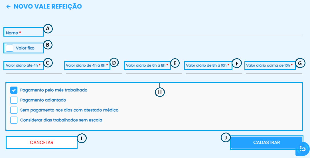 1.A Campo obrigatório (indicado pelo asterisco) para definir o nome identificador do Vale-Refeição. Essa informação será exibida como referência na tela principal da funcionalidade, facilitando a busca e gestão dos cadastros.