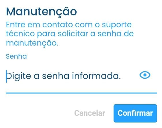 1.H Manutenção: A função de manutenção é utilizada para enviar os dados do seu aplicativo para a equipe técnica, somente quando solicitado pelo suporte. A senha necessária para esse procedimento deve ser obtida diretamente com a equipe da Iopoint.