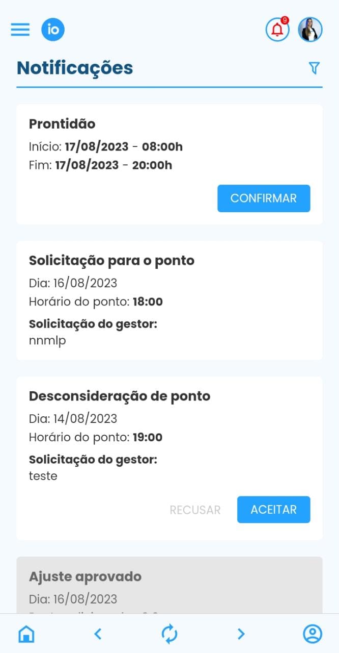 1.C Notificação: área onde encontrará todas as notificações. Por exemplo, quando o gestor solicita um ajuste de ponto, desconsidera um registro ou realiza outras alterações relacionadas ao seu ponto.