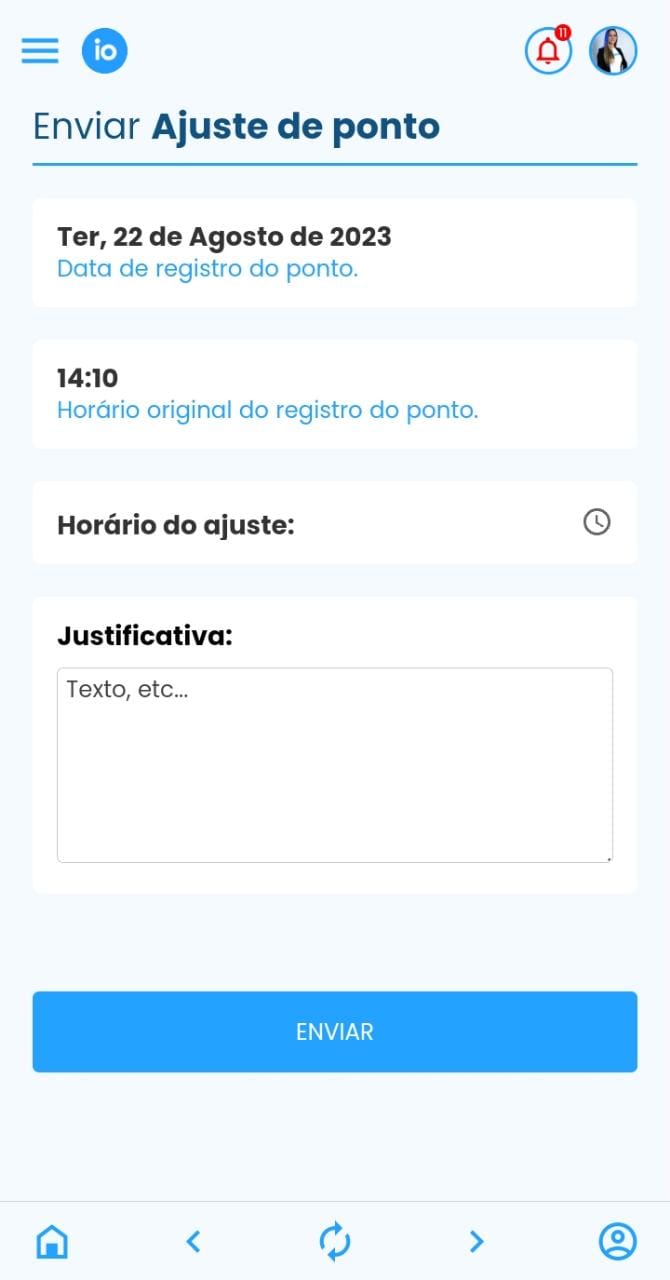 Para solicitar um ajuste de ponto, clique no ícone de prancheta image.png, informe o horário do ajuste e sua justificativa. Para finalizar clique em “enviar”.