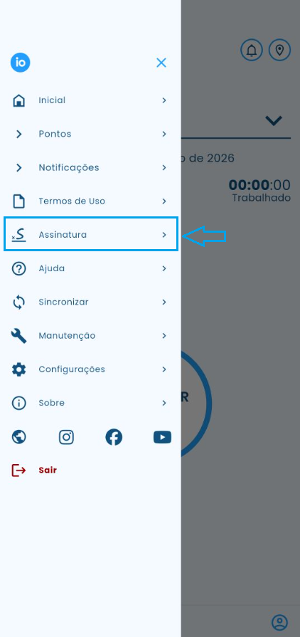 Para prosseguir com a assinatura de um documento, é necessário que a assinatura digital já esteja configurada; para desenhá-la, clique nas três barras no canto superior esquerdo da tela inicial do aplicativo e selecione a opção Assinatura.