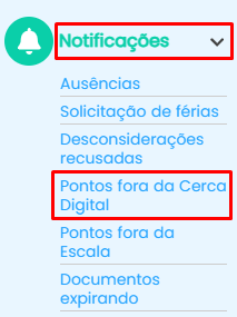 Para acessar os Pontos fora da cerca digital clique em Notificações >> Pontos fora da cerca digital, canto esquerdo da sua tela.