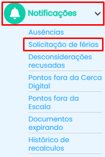 Para acessar as solicitações de férias clique em Notificações >> Solicitações de férias, canto esquerdo da tela.